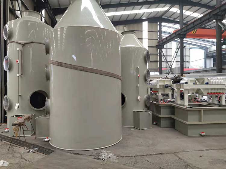 1.5萬風量pp噴淋塔塔規格為:ф1.8m*H4.0m*10mm。進、出風口直徑均為600mm。循環水量每小時22立方。每小時處理廢氣量15000立方左右。凈化塔整體厚度為8mm PP板。塔體內部有二層水噴淋裝置,三層浮球填充,帶水箱和2.2KW純銅芯普通循環水泵。