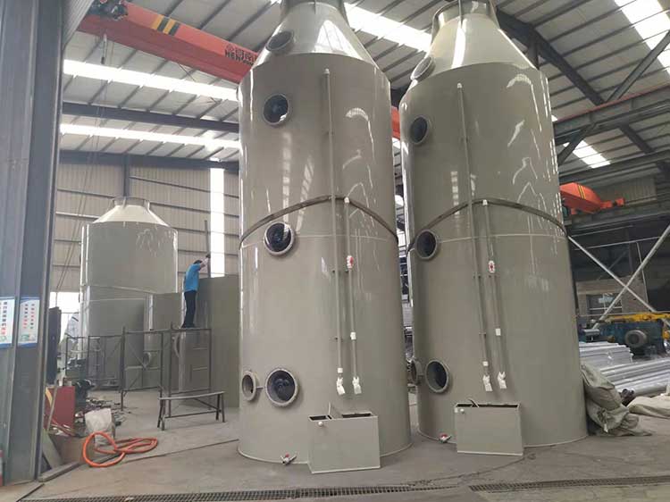 廢氣凈化塔利用氣體與液體間的接觸,而將氣體中的污染物傳送到液體中,然后再將清潔氣體與被污染的液體分離,達(dá)到清凈空氣的目的。廢氣經(jīng)由廢氣凈化塔,采用氣液逆向吸收方式處理,即液體自塔頂向下以霧狀(或小液滴)噴撒而下。廢氣則由塔體(逆向流)達(dá)到氣液接觸之目的。此處理方可冷卻廢氣、調(diào)理氣體及去除顆粒,再經(jīng)過(guò)除霧段處理后,排入大氣中。