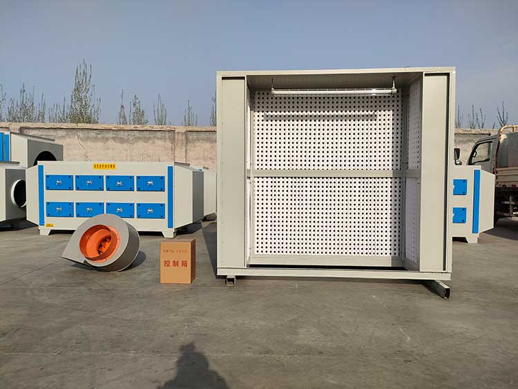 環保干式噴漆柜,用折流式過濾紙、玻纖過濾棉相結合方法,可有效吸收超范圍的噴涂漆霧。過噴氣流先經過折流紙,使氣流多次改動流動方向,這樣那些比空氣重的顆粒會粘附在折流板壁上,不會隨氣流而帶走,部分細微顆粒經過纖維過濾棉進行二次過濾,漆霧凈化作用高達98%以上。去除漆霧的有機氣體再經過活性炭吸附箱或光氧催化設備凈化后高空排放。