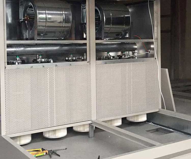 含塵氣體進入除塵設備灰斗后,因為氣流斷面突然擴展,氣流中一有些顆料粗大的塵粒在重力和慣性力效果下沉降下來;粒度細、密度小的塵粒進入過濾室后,經過布朗分散和篩濾等歸納效應,使粉塵沉積在濾料外表,凈化后的氣體透過濾筒進入上箱體的凈氣腔并聚集至出風口排出。