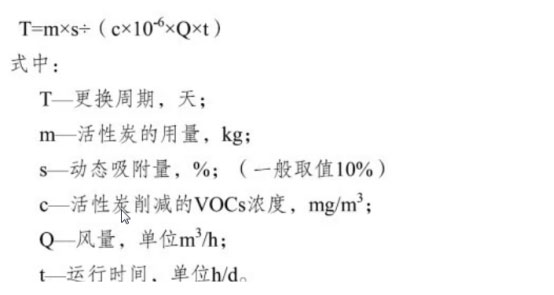 計算示例:某企業,通過活性炭吸附設施處理的VOCs廢氣風量為10000m3/h,廢氣進口VOCs濃度為200mg/m3,出口VOCs濃度為40mg/m3(即活性炭削減VOCs濃度為160mg/m3),每日運行時間8小時,活性炭吸附設施填充活性炭1000kg,則更換周期為7天!